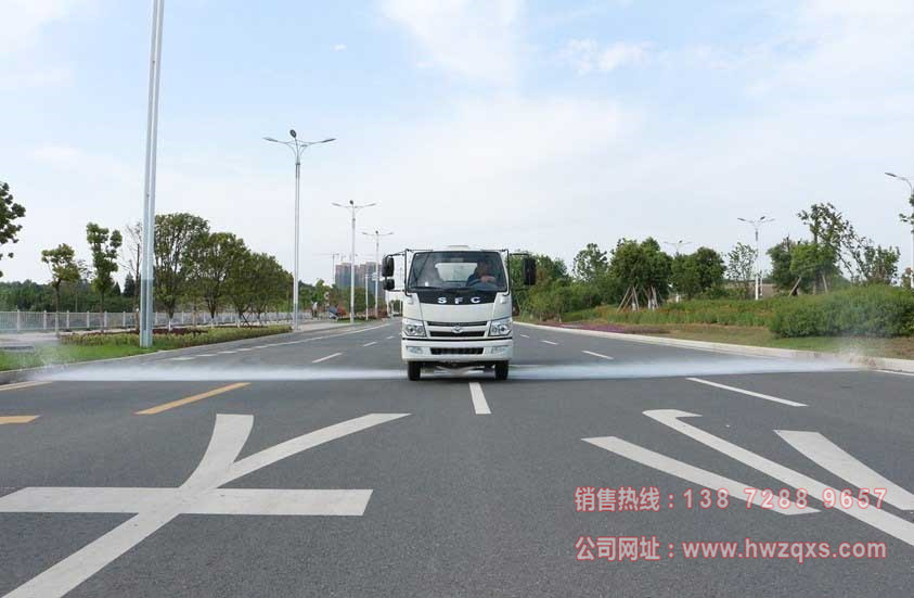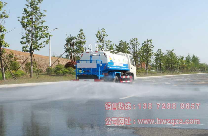 罐体材质为厚4mm武钢优质板材,洒水泵,洒水高炮,工作平台,取力器,前冲,后洒,万向嘴,自流阀,滤网,分配阀,喷头,带自吸自排功能。